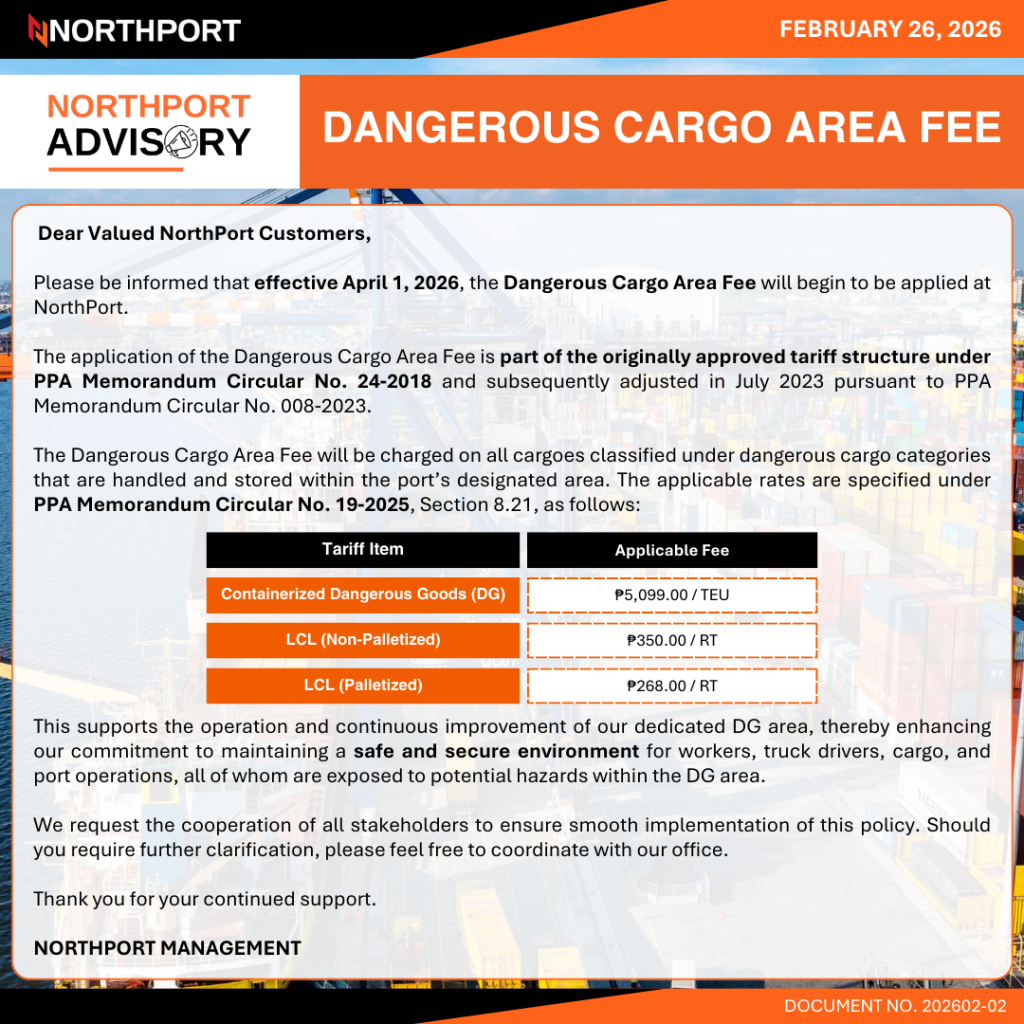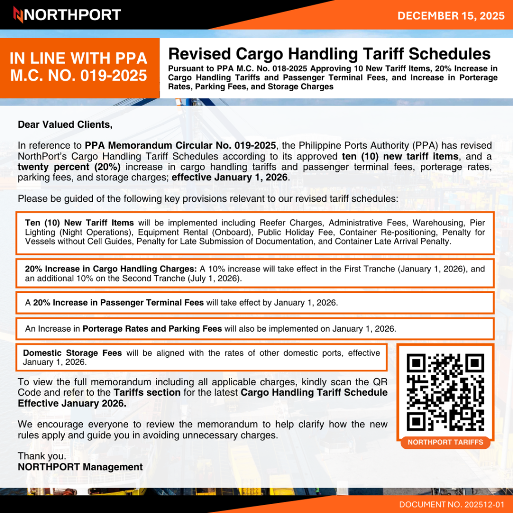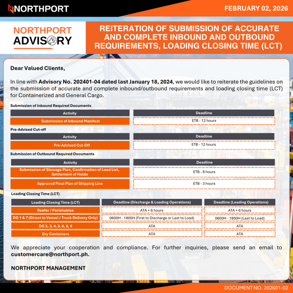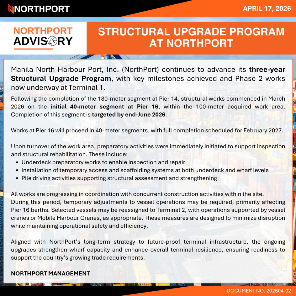 04-17-2026 202604-02 STRUCTURAL UPGRADE PROGRAM AT NORTHPORT 02-26-2026 202602-02 DANGEROUS CARGO AREA FEE 02-02-2026 202601-02 REITERATION OF SUBMISSION OF ACCURATE AND COMPLETE INBOUND AND OUTBOUND REQUIREMENTS, LOADING CLOSING TIME (LCT) 03-14-2026 202603-01 STRUCTURAL UPGRADE PROGRAM AT NORTHPORT 02-19-2026 202602-01 STRUCTURAL UPGRADE PROGRAM AT NORTHPORT 01-03-2026 202601-01 STRUCTURAL UPGRADE PROGRAM AT NORTHPORT - 2025